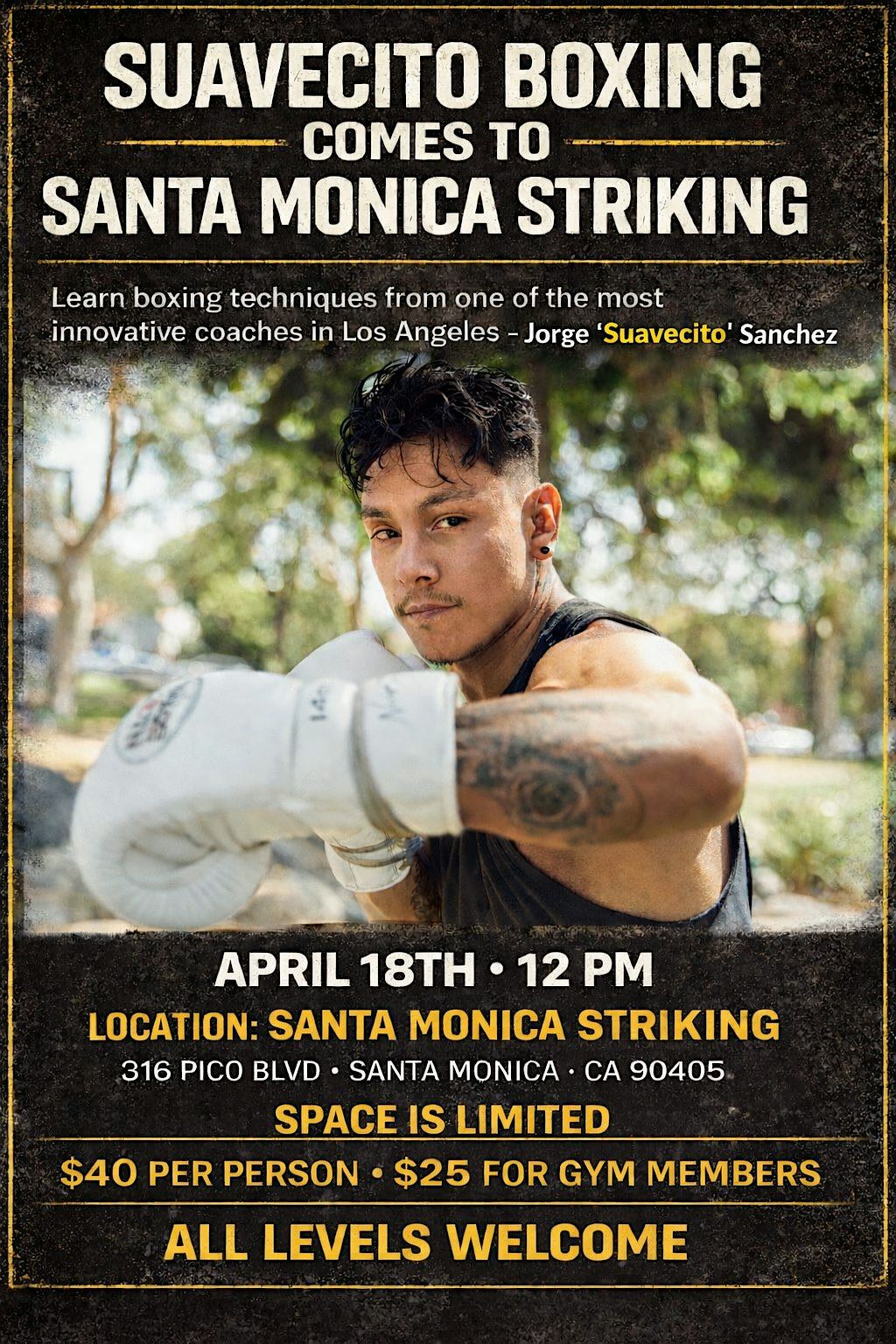 Get ready to up your boxing game with the Suavecito Boxing Seminar happening live at Santa Monica Striking! Join us in person for unique training drills, techniques, and a fun atmosphere where you can learn directly from Venice's very own, Jorge Sanchez.