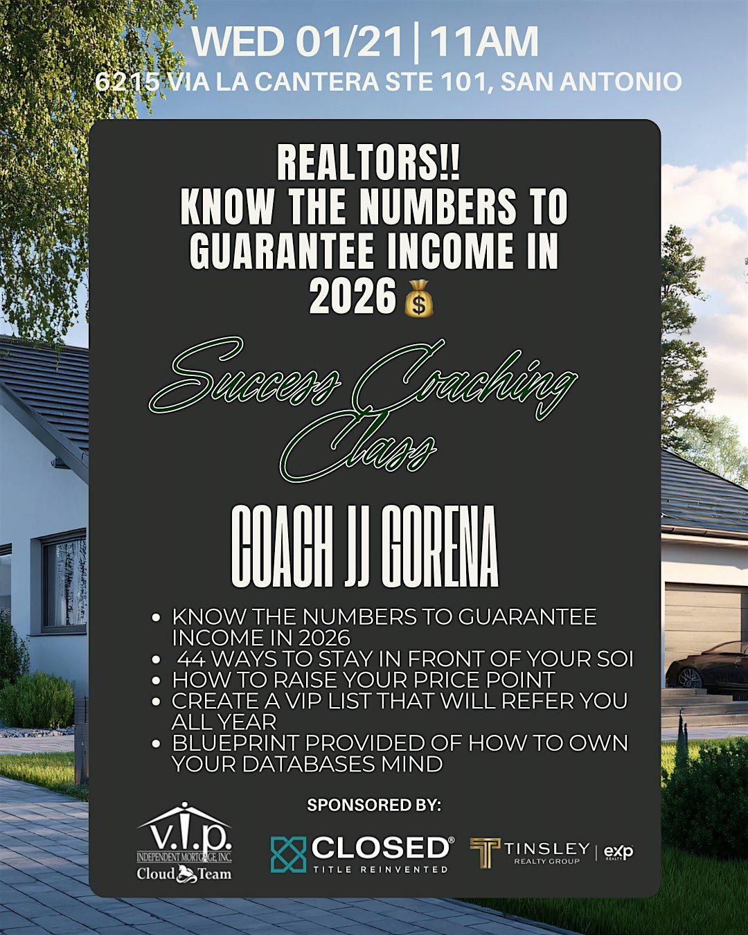 Realtors: learn the numbers to guarantee income in 2026 with Coach JJ Gorena—pricing, SOI, and a VIP referral blueprint.