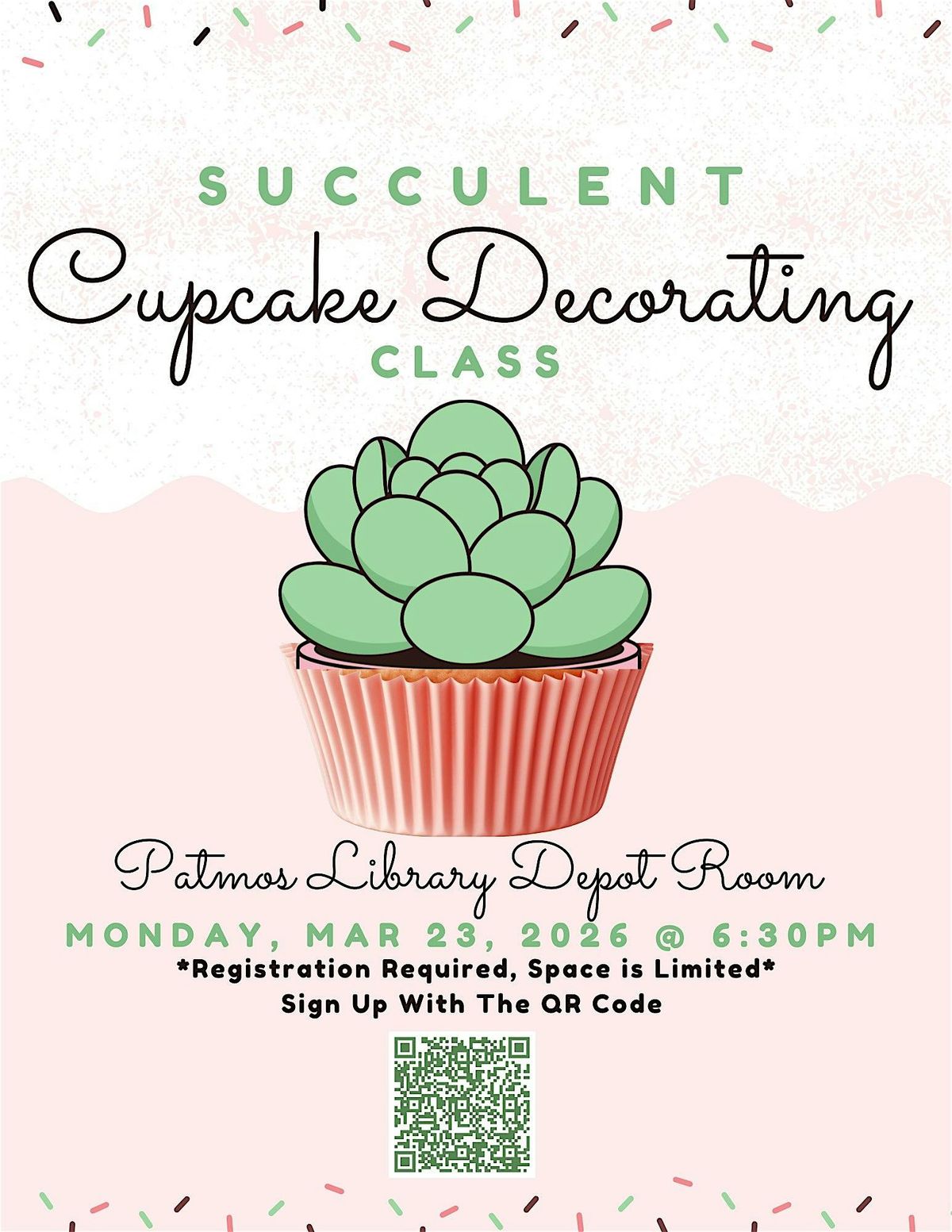 Come join us for a fun and interactive Succulent Themed Cupcake Decorating Class at the Patmos Library.