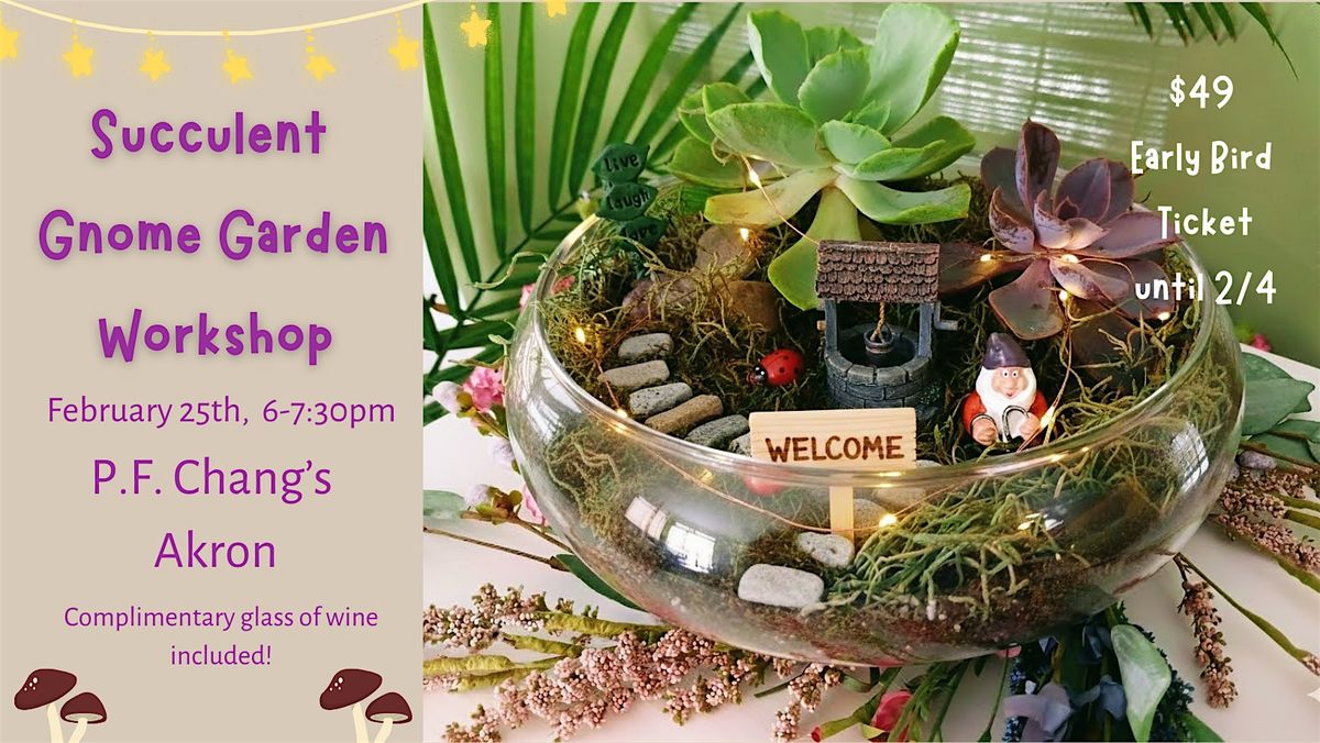 Join us for a whimsical tabletop garden workshop where you'll create your own enchanting miniature landscape in an 8" vase! Using live succulents as the foundation, you'll design a charming garden complete with tiny gnomes and fun accessories to bring your scene to life. Our expert instructor will guide you through plant care, arrangement techniques, and creative decorating tips to make your garden truly unique. Perfect for all skill levels, this hands-on experience is a delightful way to express your creativity and take home a beautiful, living masterpiece. Complimentary glass of wine included!