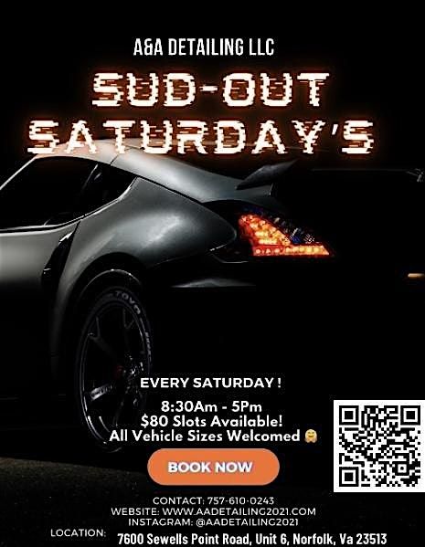 Welcome to Sud Out Saturdays! Join us every Saturday at A&A Detailing LLC for a fun-filled car detailing event. Get your vehicle looking squeaky clean with our expert team of detailers. Whether you're a car enthusiast or just looking to spruce up your ride, this event is perfect for you. Come hang out, enjoy some music, and watch your car transform before your eyes. Don't miss out on the chance to give your car some much-needed TLC. See you there!