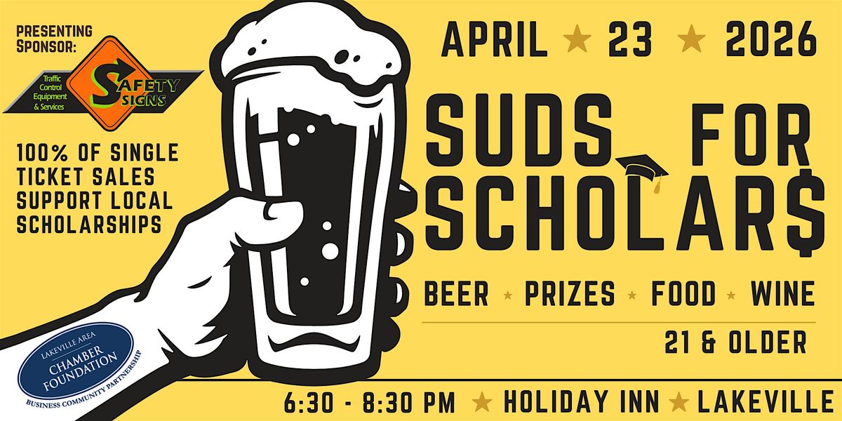 On April 23rd, the Lakeville Chamber Foundation is hosting our 9th annual Suds for Scholars fundraising event. The event, hosted at the Holiday Inn & Suites Lakeville, includes sampling from each brewer, while they tell you about their favorite creations. Bring a friend, a date, or your colleagues for an evening of beer and wine tasting, hot and hearty appetizers, and prize drawings. The generosity of our brewers – who donate their time and all their spirits – as well as several local sponsors, make it possible for 100% of single ticket sales to go directly into the Foundation’s scholarship fund.