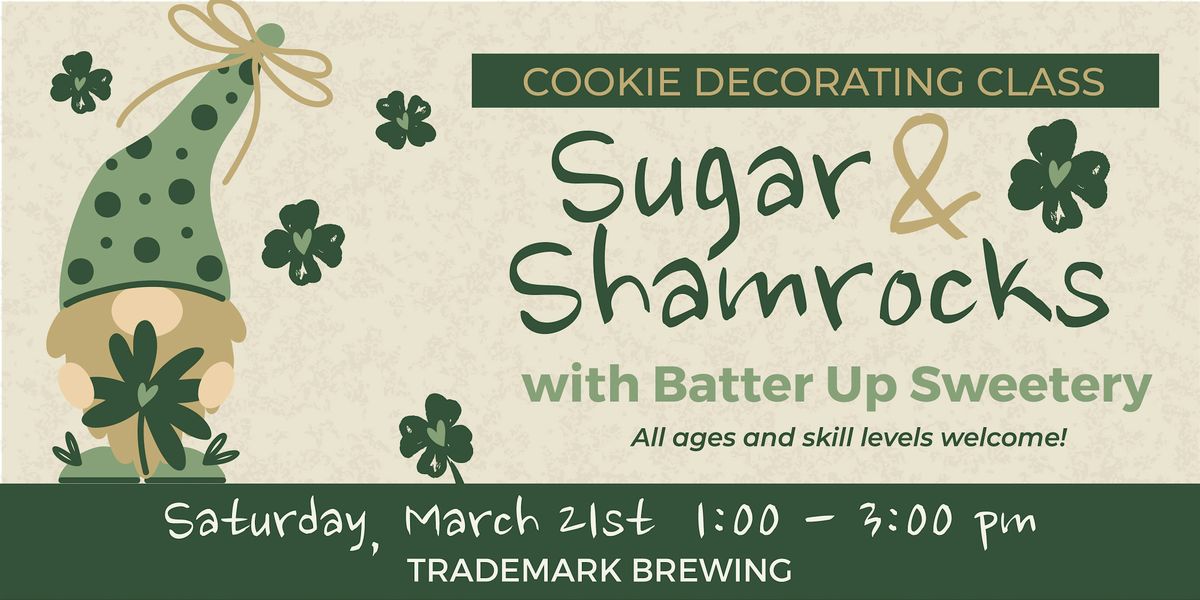 Celebrate the season with a hands-on Sugar & Shamrocks Cookie Decorating Class led by local cookie artist Alenni Chitwood of Batter Up Sweetery at Trademark Brewing on Saturday, March 21 from 1–3 PM.