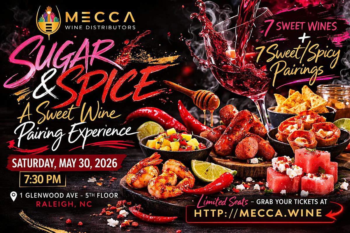 Join us at Mecca Wine Tasting Room in Downtown Raleigh for a playful and flavor-packed evening featuring 7 sweet wines paired with 7 sweet & spicy bites designed to highlight the bold and delicious contrast between sugar and spice.