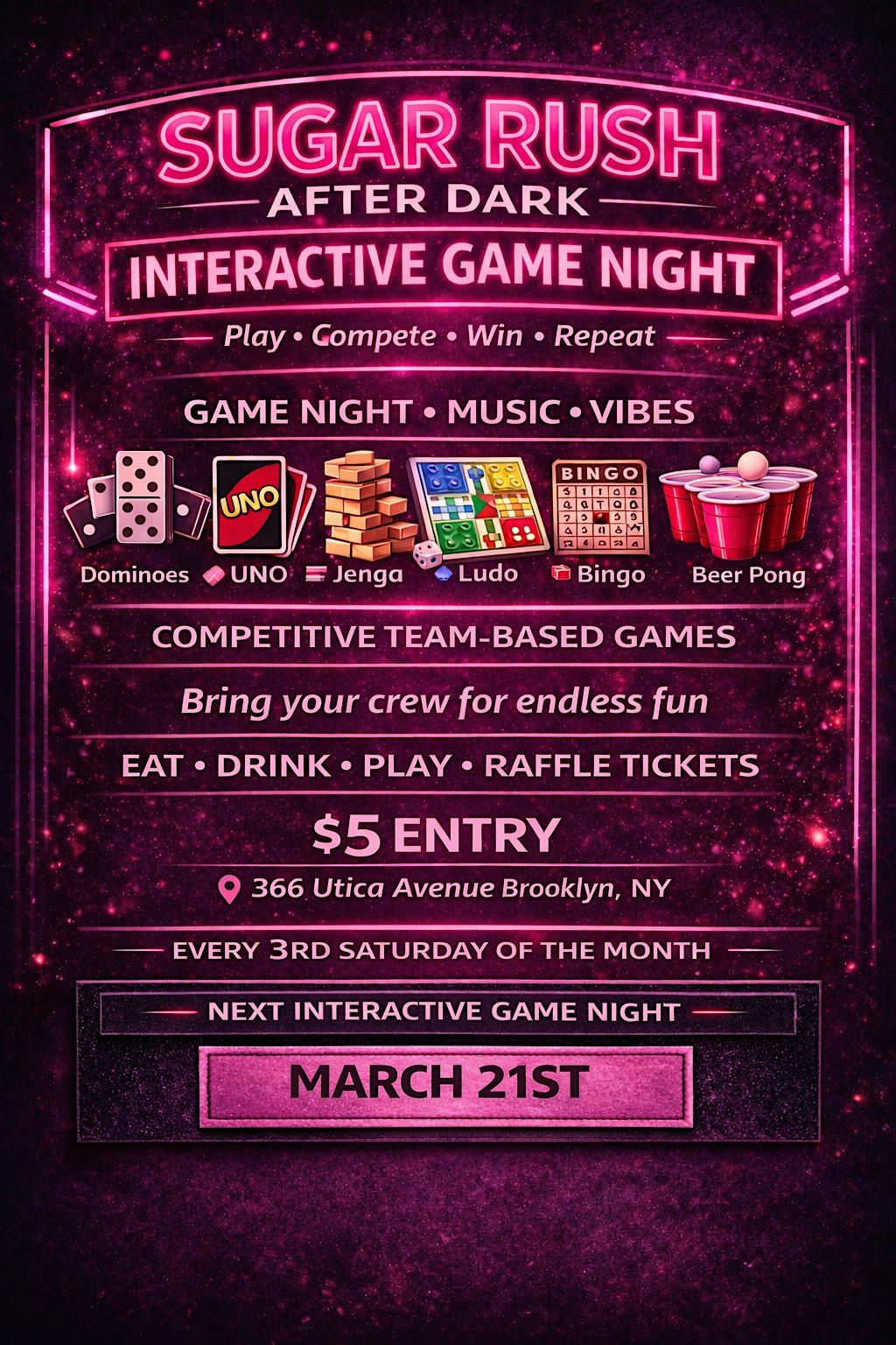 Grab your crew and get ready for a night of competition, laughs, and good vibes. This isnโt your typical game night โ itโs a high-energy team experience where strategy, teamwork, and a little luck decide which crew takes the crown.