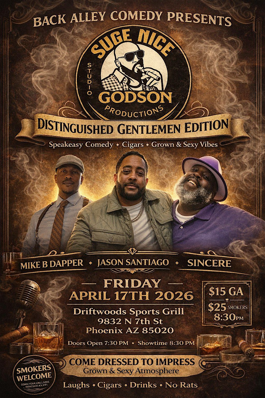 This event is curated and hosted under the creative direction of Suge Nice, the Phoenix-based comedian known for his unapologetic stage presence, cigar-smoking persona, and ability to create rooms that feel more like a private comedy party than a traditional show. When you step inside this event, you’re not just watching a lineup—you’re stepping into a vibe.