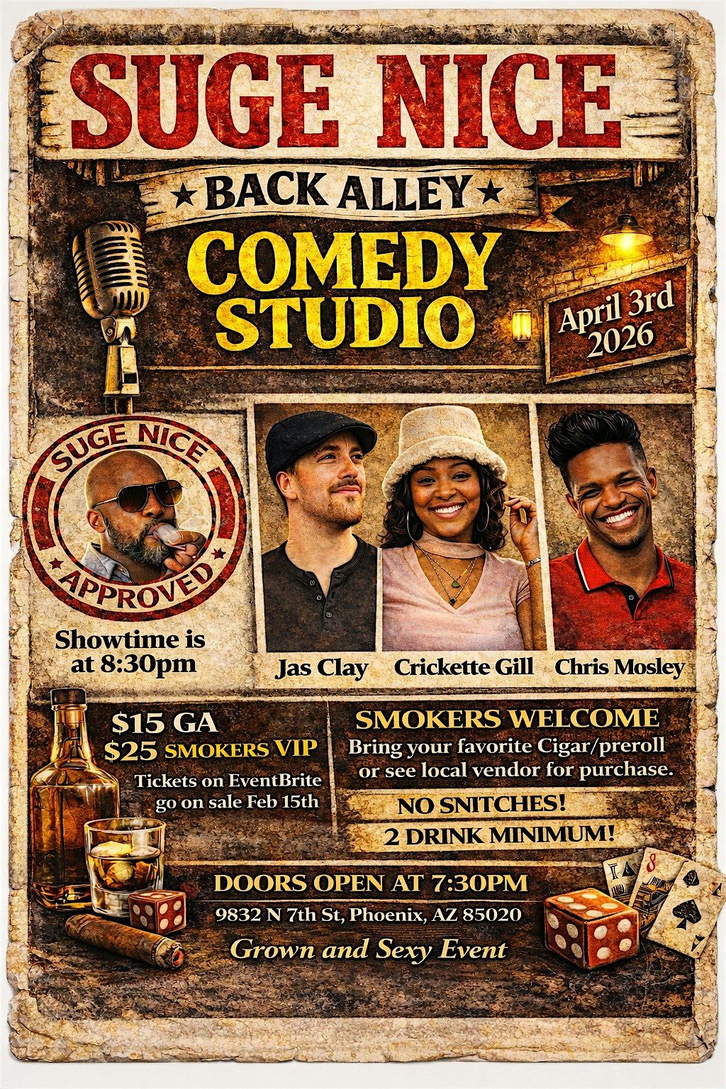 On April 3rd, 2026, comedy fans in Phoenix are invited into an atmosphere that blends underground comedy culture, 420-friendly vibes, cigars, strong drinks, and the kind of fearless stand-up that made shows like Def Comedy Jam legendary. The Back Alley Comedy Studio is where comics come to be themselves, and audiences come to experience comedy without filters.