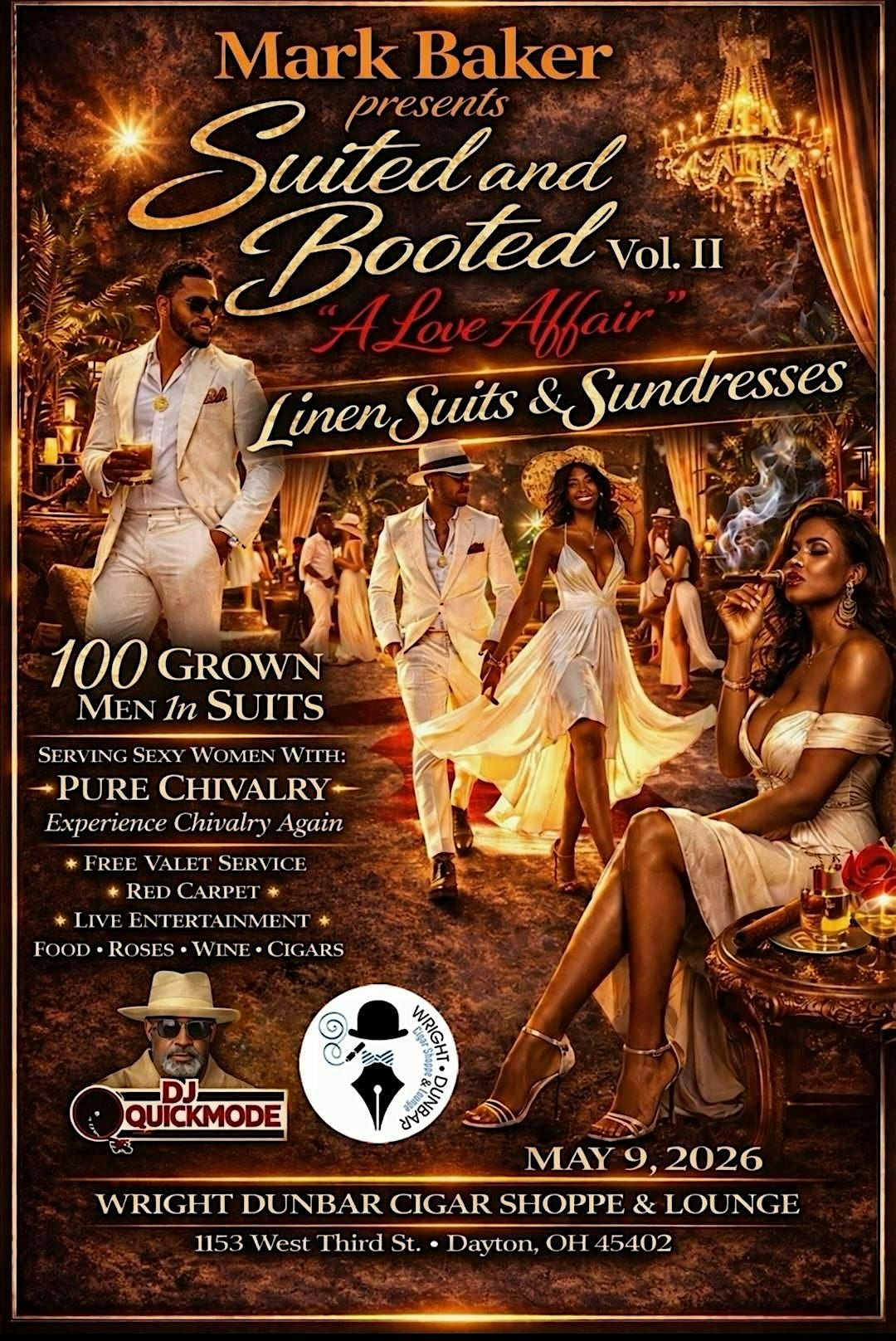 Get ready to rock those linen suits and sundresses! This in-person event is all about style, summer vibes, and good times. Whether you're suiting up or keeping it breezy, come join the fun and celebrate love and fashion in one unforgettable night. Don’t miss out on Suited & Booted Vol. 2—where elegance meets easygoing charm.