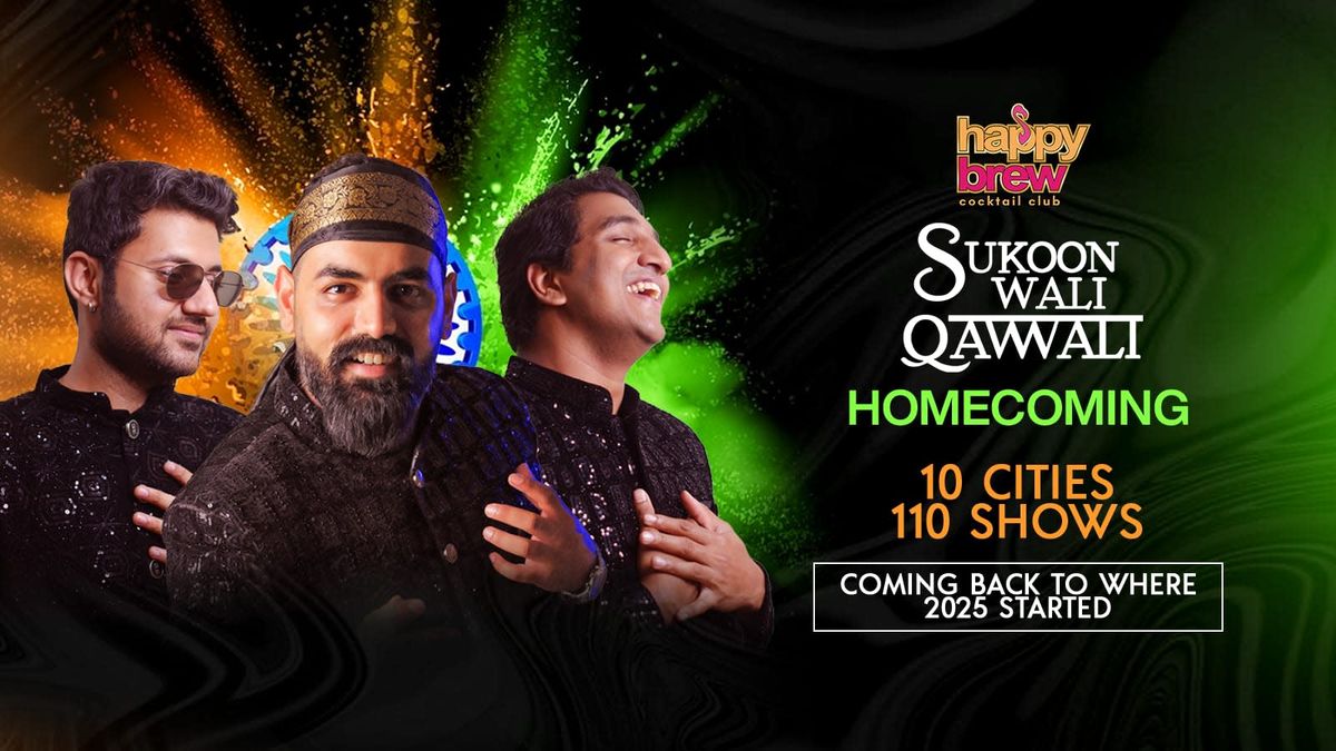 From 10 cities. From 110 soul-stirring shows.The journey now comes full circle. 🖤Sukoon Wali Qawwali is coming back home — to the very stage where 2025 began, where the sukoon first flowed, and memories were created with every note.This Homecoming Night is not just another performance.It’s a celebration of music, rooh, mehfil and togetherness.An evening where voices meet hearts and qawwali meets sukoon. ✨Come be a part of a night that’s emotional, powerful and unforgettable.Because some journeys deserve a beautiful return.T&C Apply-Ethnic Dresscode MandatorySeating only to vip table bookingsDance floor access strictly for VIP passes