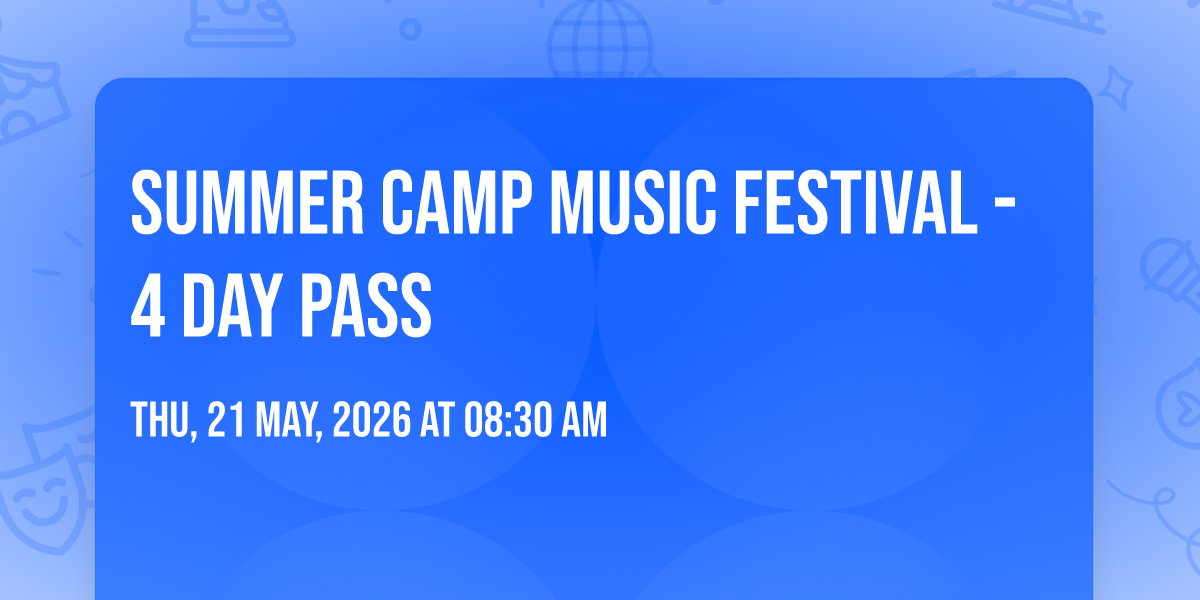📍 Location: 40.8934, -89.5036🎉 Welcome to Summer Camp Music Festival - 4 Day Pass, where dreams come alive and possibilities are endless! 🏛️ Join us at Three Sisters Park in the heart of Chillicothe, IL for an event that defies expectations. 📅 On May 21st, 2026 at 08:30 AM, be part of something truly extraordinary as we bring together innovation, entertainment, and pure magic. ✨ Every aspect has been carefully designed to ensure an unforgettable experience for all our guests. Whether you're seeking adventure, inspiration, or simply a break from the ordinary, this event promises to deliver beyond your wildest dreams. 🎊 Prepare for a journey into the extraordinary!