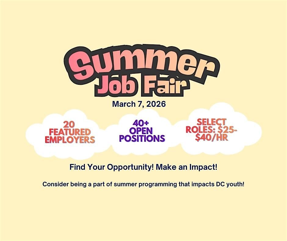 Ready to put your skills to work this summer? Join our Summer Employment Job Fair and connect with employers hiring for roles supporting youth programs. Meet hiring managers, explore meaningful opportunities, and find a position where you can make a real difference. Register early to save your spot.