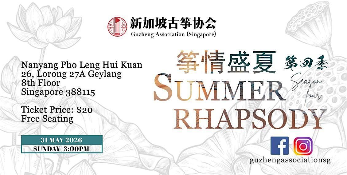 Come experience the beauty of guzheng music at Summer Rhapsody 4! Join us on May 31, 2026, at 3 PM (SGT) at Nanyang Pho Leng Hui Kuan for an enchanting midsummer concert, 《筝情盛夏》, featuring expressive guzheng solos and dynamic ensemble pieces that capture the warmth and spirit of Chinese music.