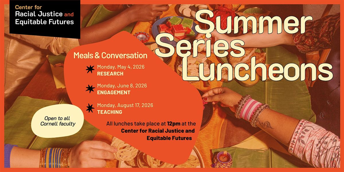 This summer, all Cornell faculty are invited to join the Center for Racial Justice and Equitable Futures for shared meals centered around a themed conversation. We'll provide the food! Join one or all three meals and engage with your colleagues on topics to nourish camaraderie as much as professional and personal development: