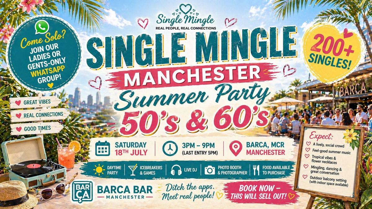 🌴 Join 200+ singles in their 50’s & 60’s for our daytime summer party on the balcony at Barca, Manchester. No swiping — just great vibes, real conversations, and a packed social atmosphere.