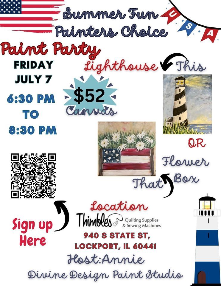 Save the Date! Friday July 7th! Please join us for a Summer Time Fun Painters Choice Paint Night at Thimbles in Lockport. 630 to 830 pm. Choose either the Lighthouse or the Flower Box! This is a unique venue. In a Historical Building in Downtown Lockport!If you painted with us before and loved it, you are in for a treat. This Venue is amazing. We are painting on 12x16 Canvas Only people who have prepaid are able to enter venue and paint that night. If you have not painted with me in the past I wanted to take a minute thank you for your interest in Divine Design Paint Studio and the event at Thimbles! If you are a beginner and have never painted before, or have never painted in a group setting, don’t fret! I want to let you know that all of us are there to have fun and enjoy the Night. I teach all levels of painters and break it down to the basics.
