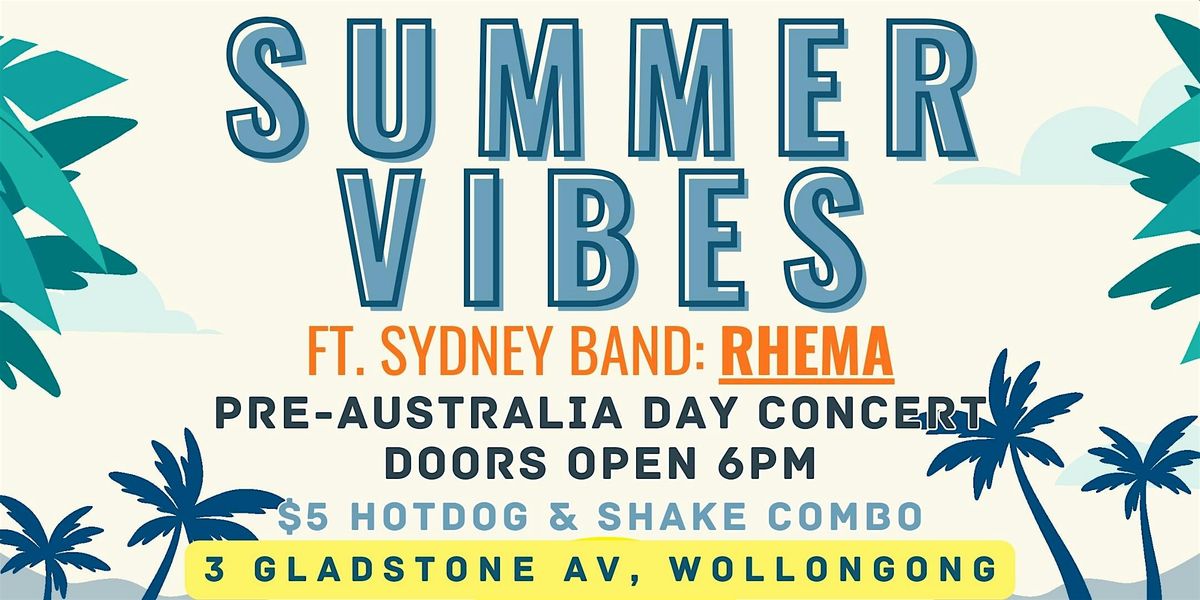 Welcome to the **SUMMER VIBES - Pre Australia Day Concert**! 🎉 Get ready to kick off the Australia Day celebrations with us at **3 Gladstone Ave** on **January 26, 2026 at 6:30 PM** (Australia/Sydney). 🌞🎶 Enjoy live music, delicious food, and good vibes together. Don't miss out on this epic event! See you there! 😎🎤