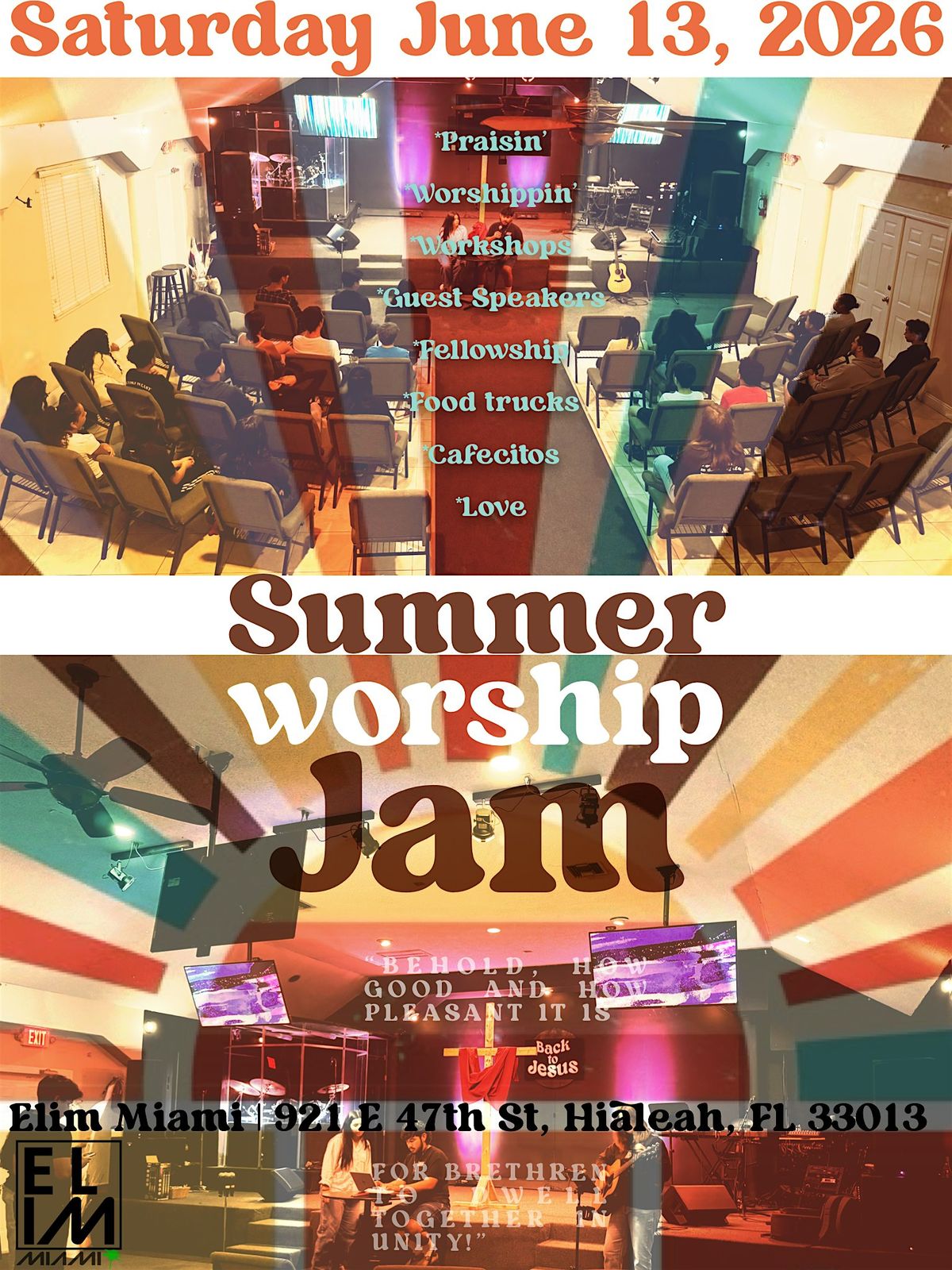 Join us Elim Miami hosts this praise&worship conference/festival/gathering where the main goal is to fellowship/network with local and not so local churches and bring brothers and sisters together to come together to lift up the name of Jesus.