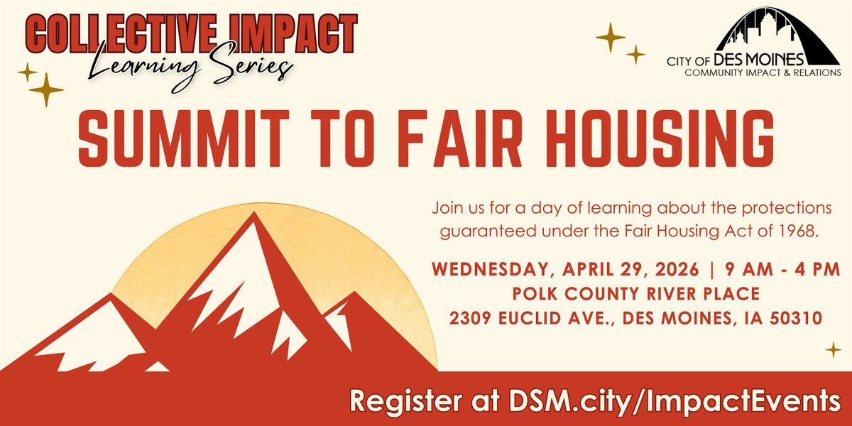 Join us on Wednesday, April 29, 2025 for the Summit to Fair Housing hosted by the City of Des Moines Community Impact and Relations Department. This event is designed to provide education in understanding the world of fair housing laws and address the current state of affairs under the new guidance of federal protections.