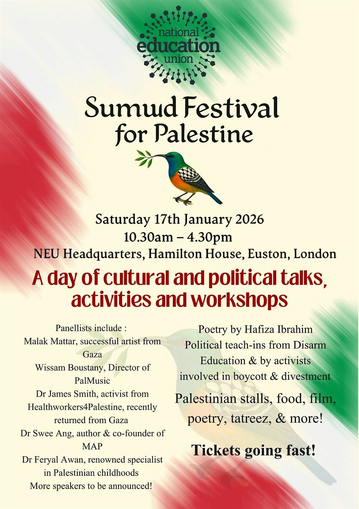 Join us for a vibrant day celebrating Palestinian culture, resilience, and solidarity. The NEU Sumud Festival for Palestine brings together artists, activists, educators and community members for a programme of inspiring talks, creative workshops and cultural activities.
