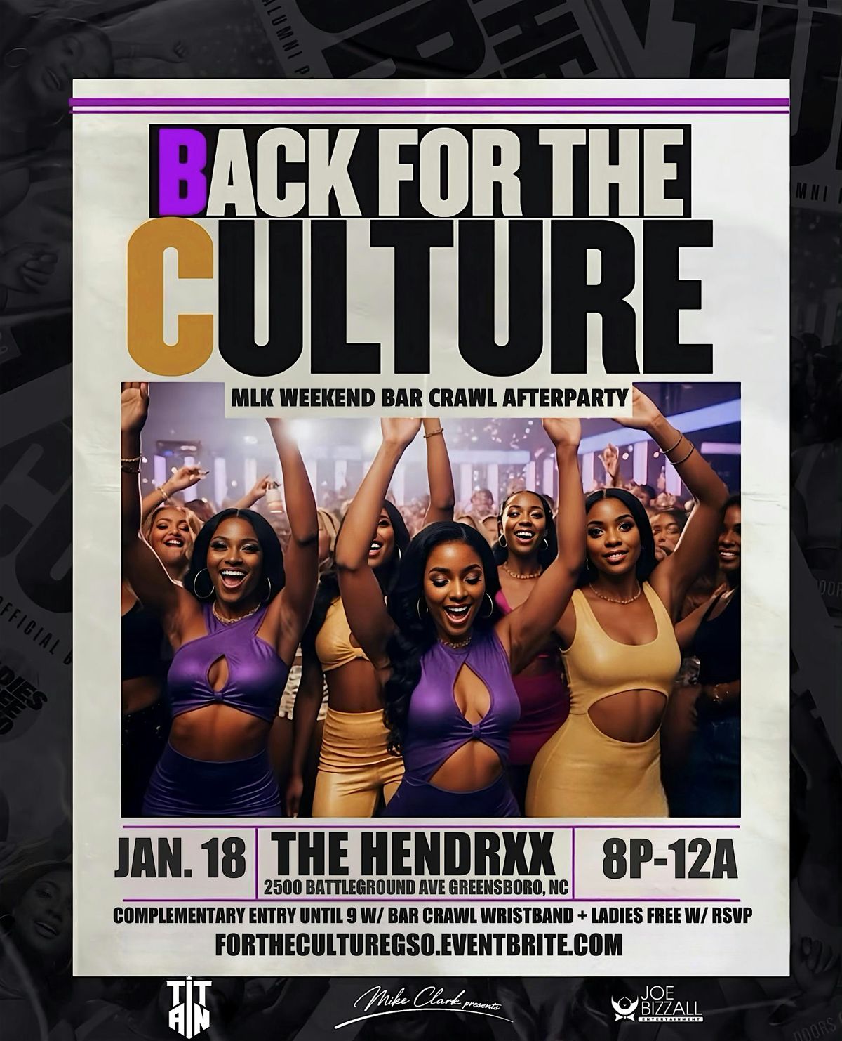Greensboro, NC • When the bar crawl comes to an end, the night continues at BACK FOR THE CULTURE • THE AFTERPARTY, the official late-night destination of MLK Weekend, hosted at The Hendrxx in Greensboro.