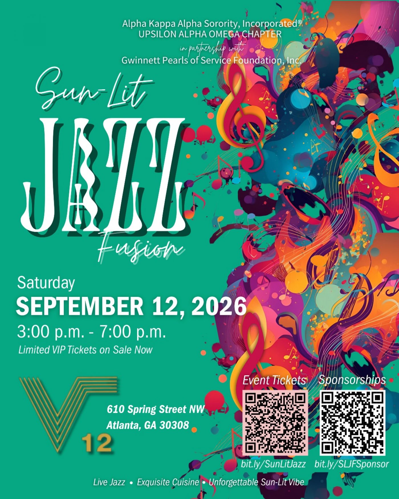 Alpha Kappa Alpha Sorority, Inc, Upsilon Alpha Omega Chapter in partnership with Gwinnett Pearls of Service Foundation will be hosting its first ever Sun Lit Jazz Fusion event on Saturday, September 12, 2026. Come enjoy live jazz, hand-crafted cocktails, and an unforgettable vibe. Proceeds from this event will go to support scholarships and community programs.