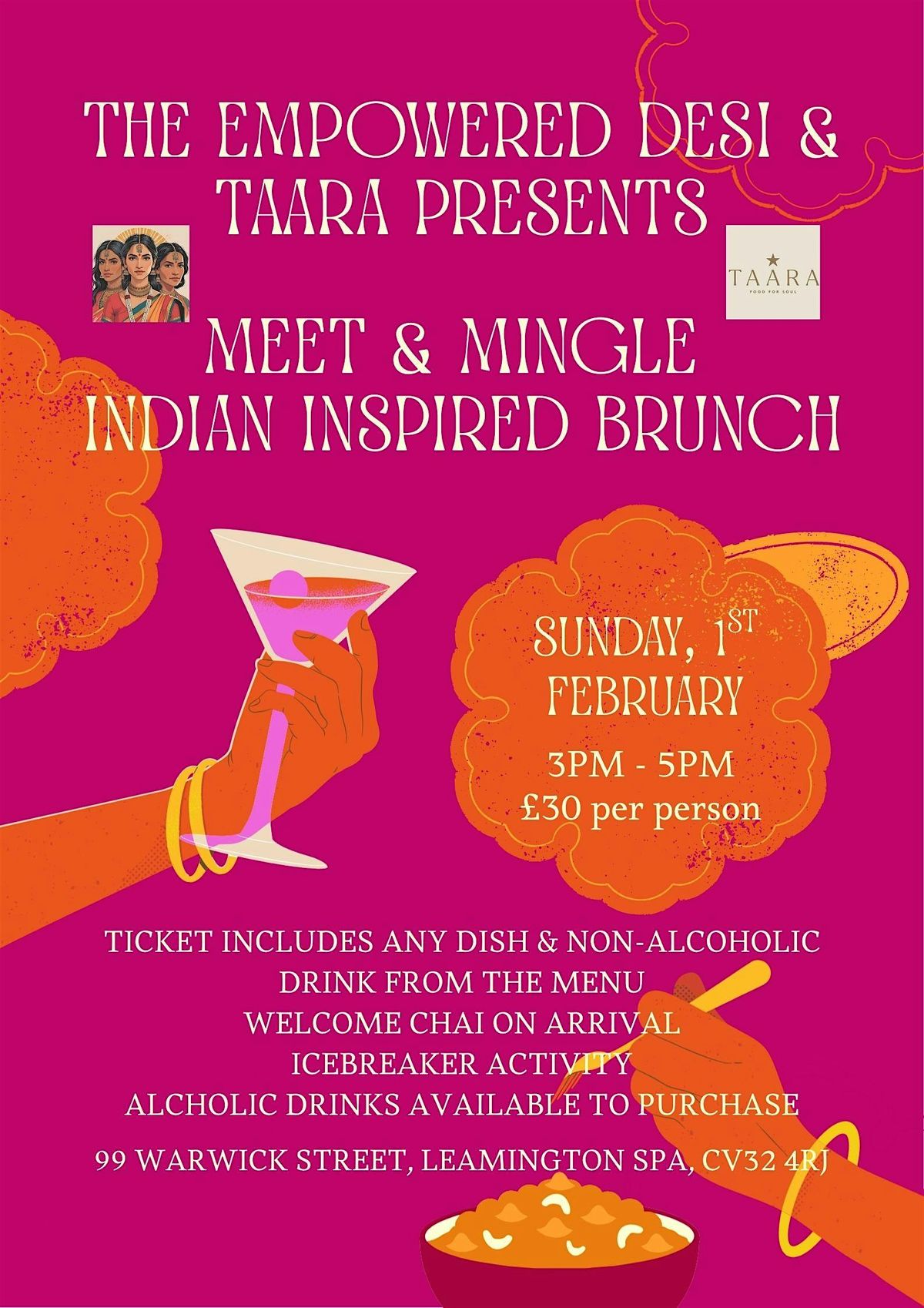 Join The Empowered Desi for the first event of 2026 at Leamington cafe Taara for a fun and light-hearted Sunday brunch. The perfect event to relax, enjoy delicious food and meet amazing new people. This event is all about good vibes and great company, a fun way to end your week and spend your Sunday!