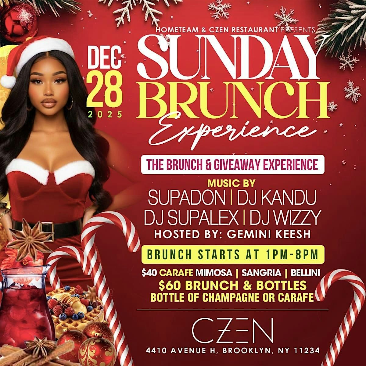 Join us for the holiday edition of the Sunday Brunch Experience December 28 | 1 PM–8 PM | CZEN Brooklyn - featuring music by Supadon, DJ Kandu, DJ Supalex, and DJ Wizzy, hosted by Gemini Keesh. Brunch service runs from 1 PM to 8 PM with signature cocktails, curated brunch selections, and bottle options.