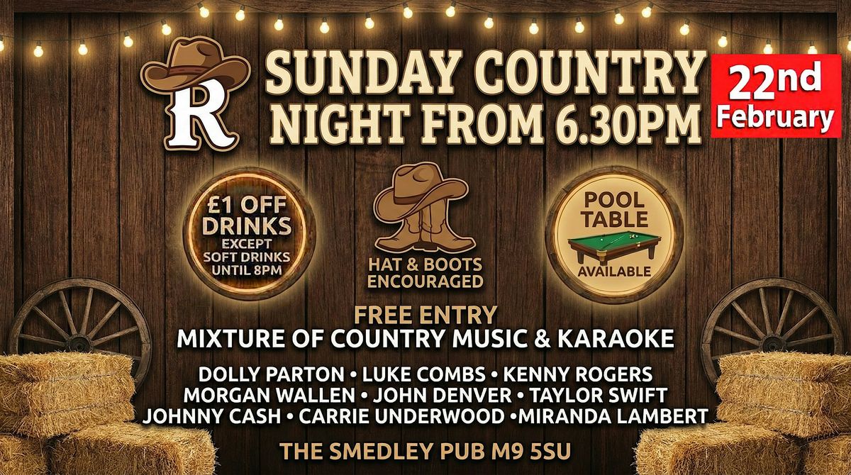 Kick back and enjoy some awesome country tunes this Sunday! Join us for an in-person gathering where the music is lively and the vibes are chill. Whether you're a country fan or just looking for a fun way to spend your day, this event’s got you covered. Bring your friends, tap your boots, and get ready for a great time!