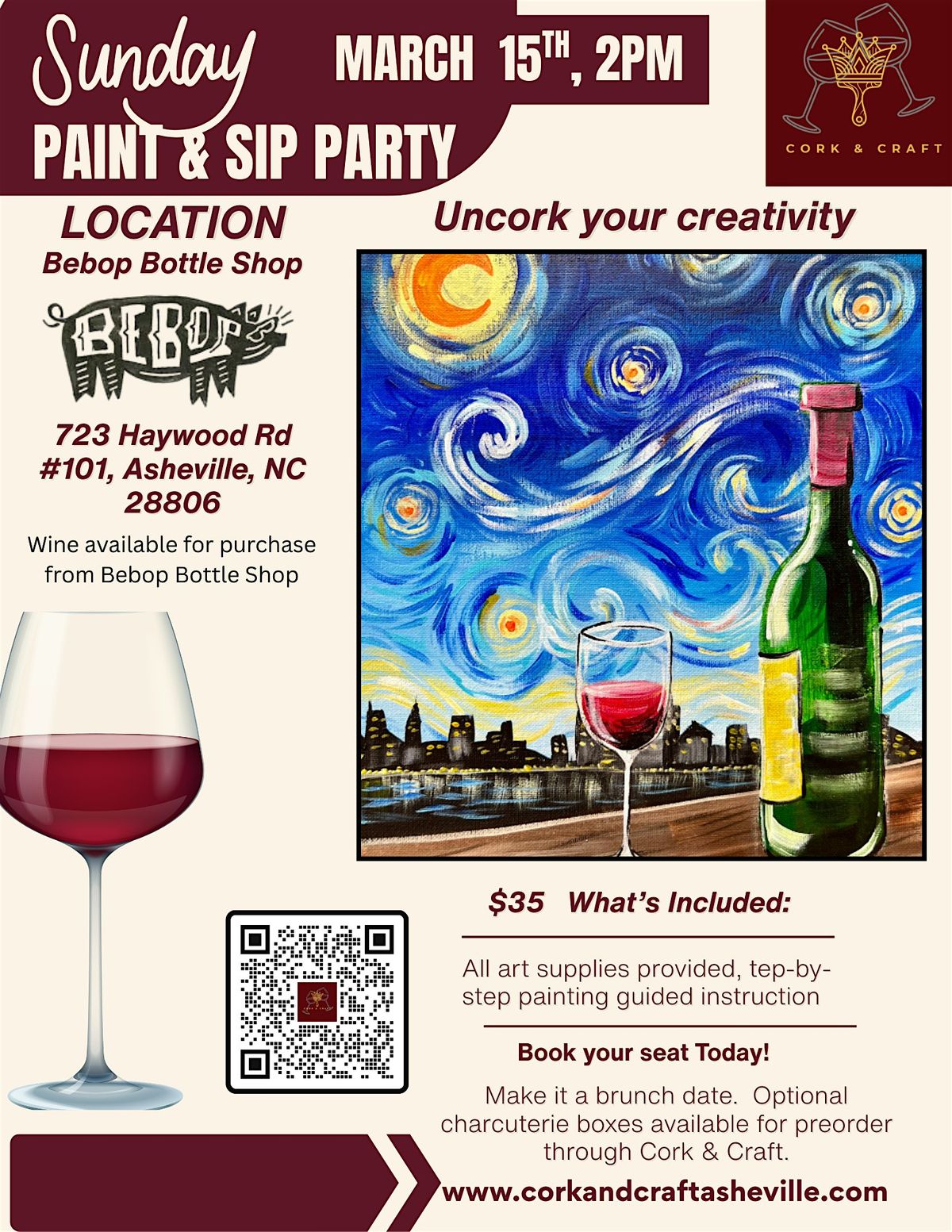 Join Cork & Craft for a relaxed Sunday afternoon of wine, creativity, and Van Gogh inspired painting at Bebop Bottle Shop in Asheville.