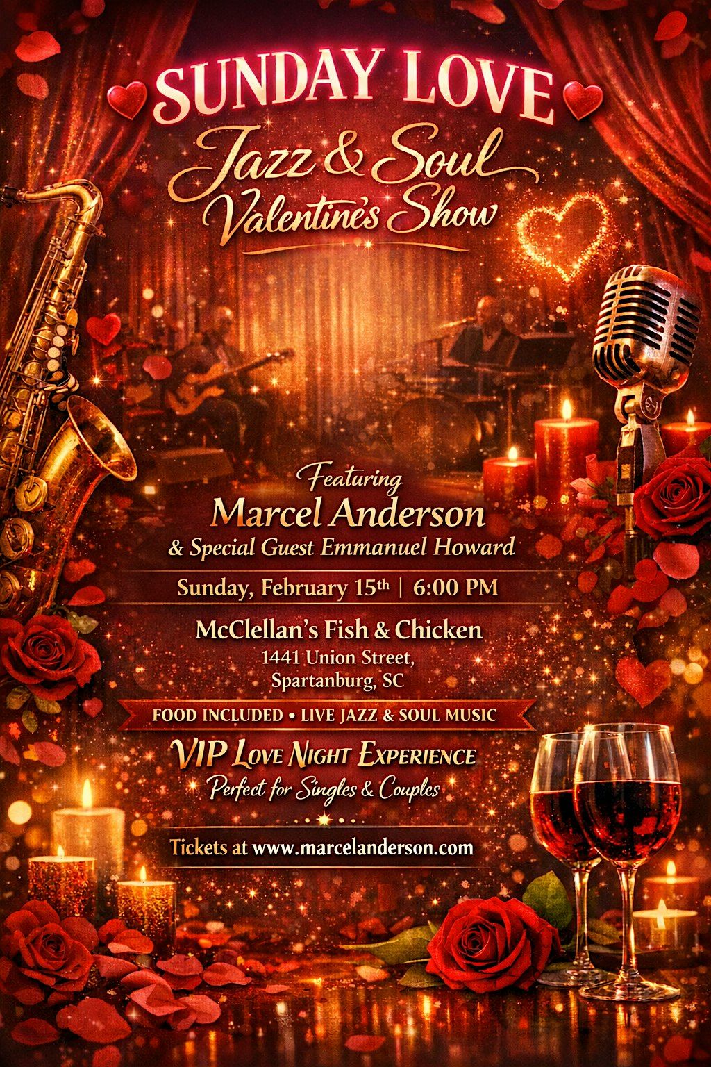 Featuring Spartanburg Native Internationl recording Artit and Vocalist Marcel Anderon with special guest saxaphonist Emmanuel Howard. Featuring Cheif McClellan's.