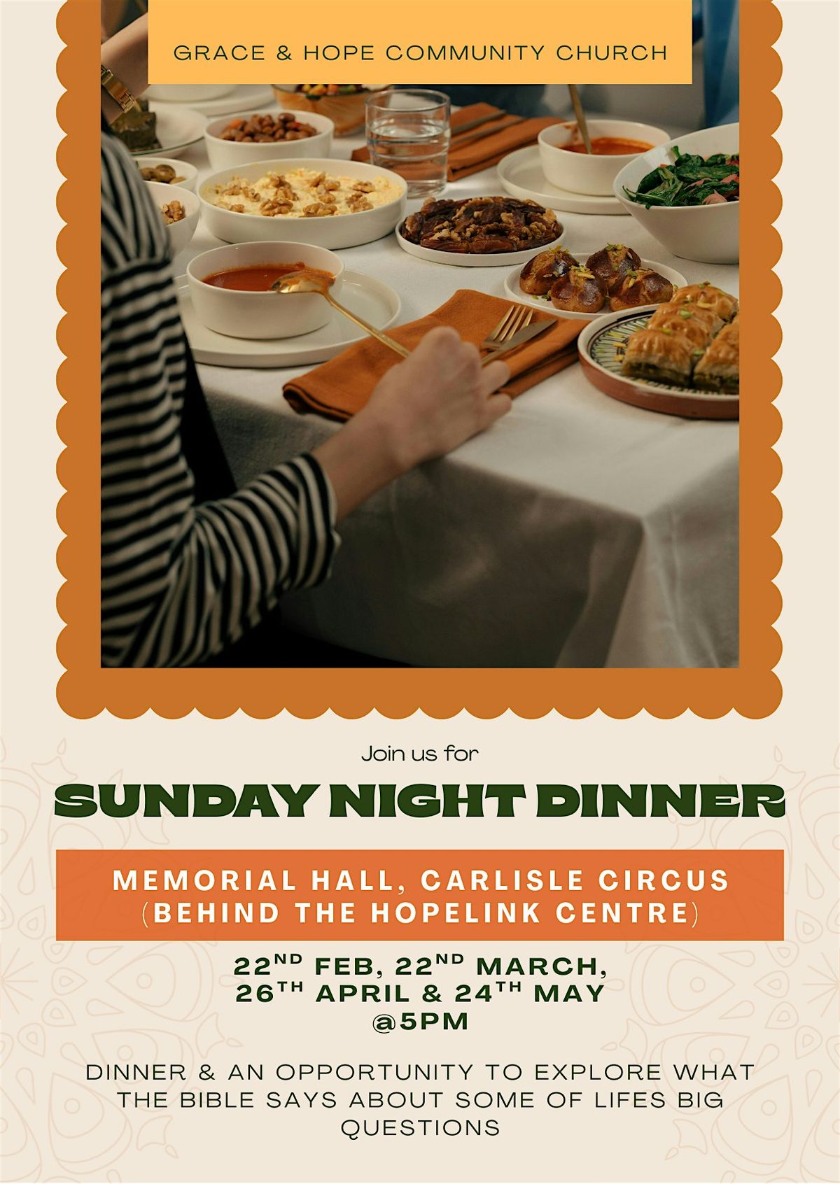 Come along to Grace and Hope Community Church's Sunday Night Dinner. There will be dinner served, tea and coffee, a short talk about what the Bible has to say about one of lifes big questions and a time to chat. You would be so welcome.