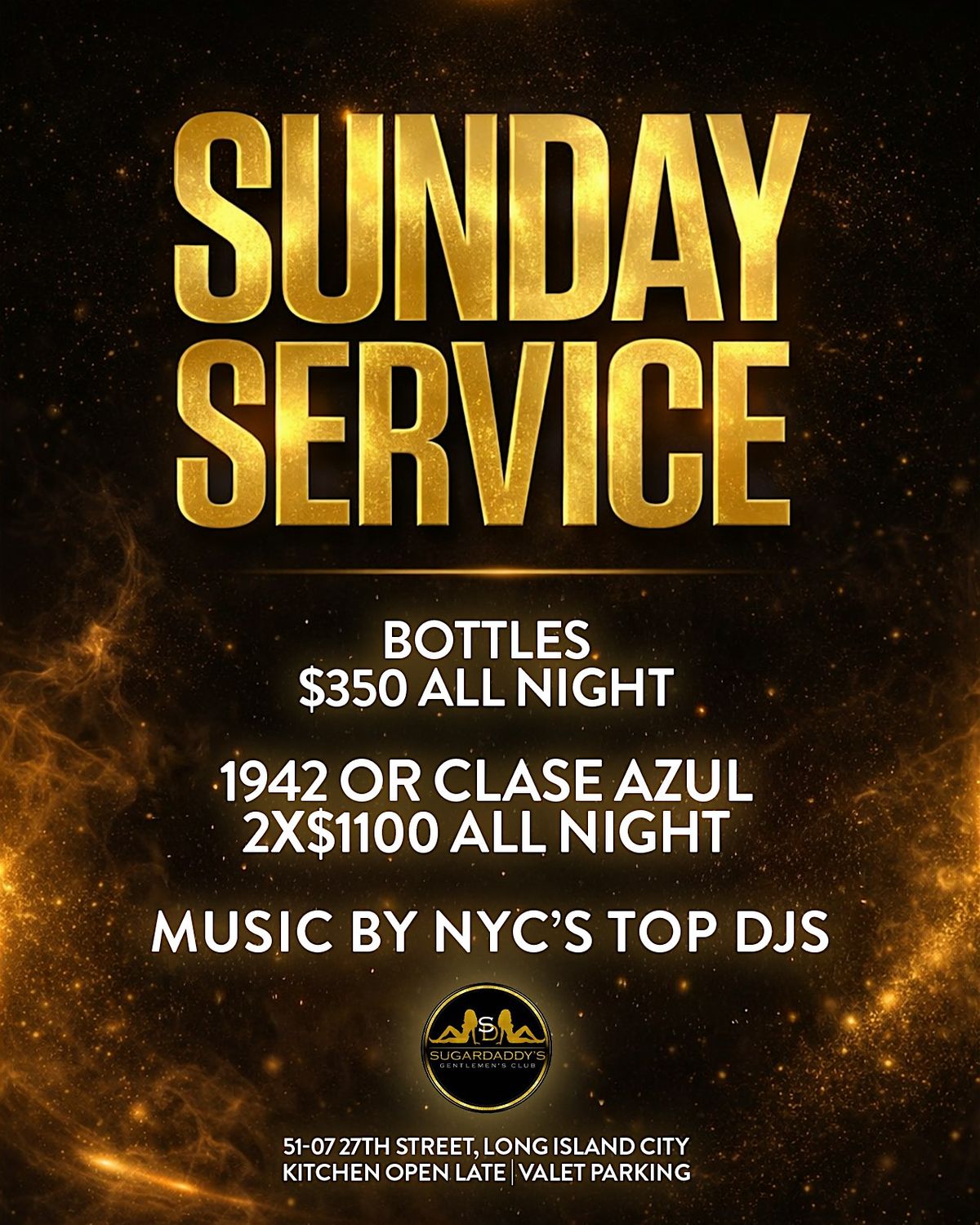 Sunday Service at Sugardaddy’s NYC — $350 bottles all night, top DJs, VIP vibes & the perfect way to end your weekend.