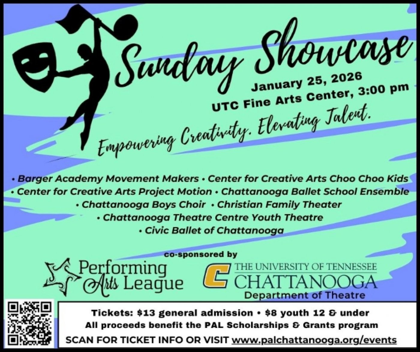 PAL President Karen Wilson comments, “We are delighted to present our annual SUNDAY SHOWCASE celebrating Chattanooga’s talented young performing artists in dance, music and theater. Once again, the event will be under the direction of Steve Ray, Head of UTC’s Department of Theatre. The stage at UTC’s Roland Hays Concert Hall will be filled with outstanding young performers from these participating schools and arts organizations: Barger Academy Movement Makers, Center for Creative Arts Choo Choo Kids, Center for Creative Arts Project Motion, Chattanooga Ballet School Ensemble, Chattanooga Boys Choir, Chattanooga Theatre Centre Youth Theatre, Christian Family Theater, and Civic Ballet of Chattanooga. PAL’s mission is to support and encourage our young people in the development of their talent and creativity as actors, dancers, and musicians. This year’s Sunday Showcase at UTC’s Fine Arts Center provides an exciting opportunity to display and recognize their artistry and enthusiasm. We hope everyone will join us in appreciating and applauding these remarkable young performers.”