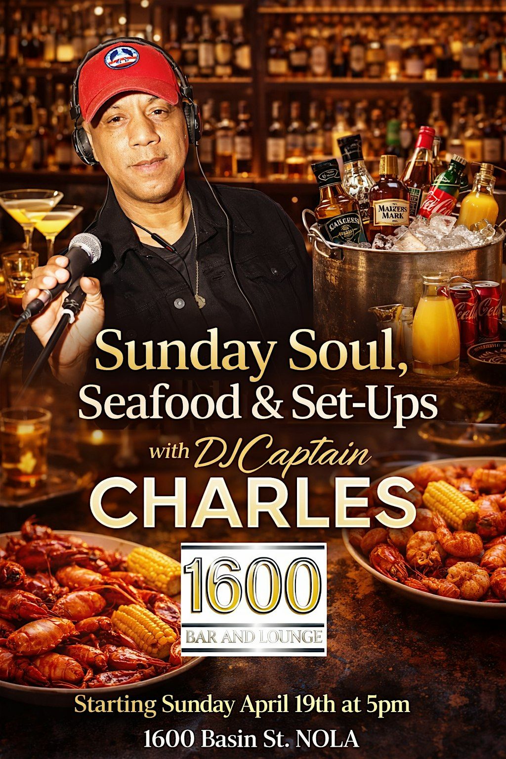 Grown-folks Sunday vibes with DJ Captain Charles, seafood plates, set-ups, and the right soundtrack at 1600.