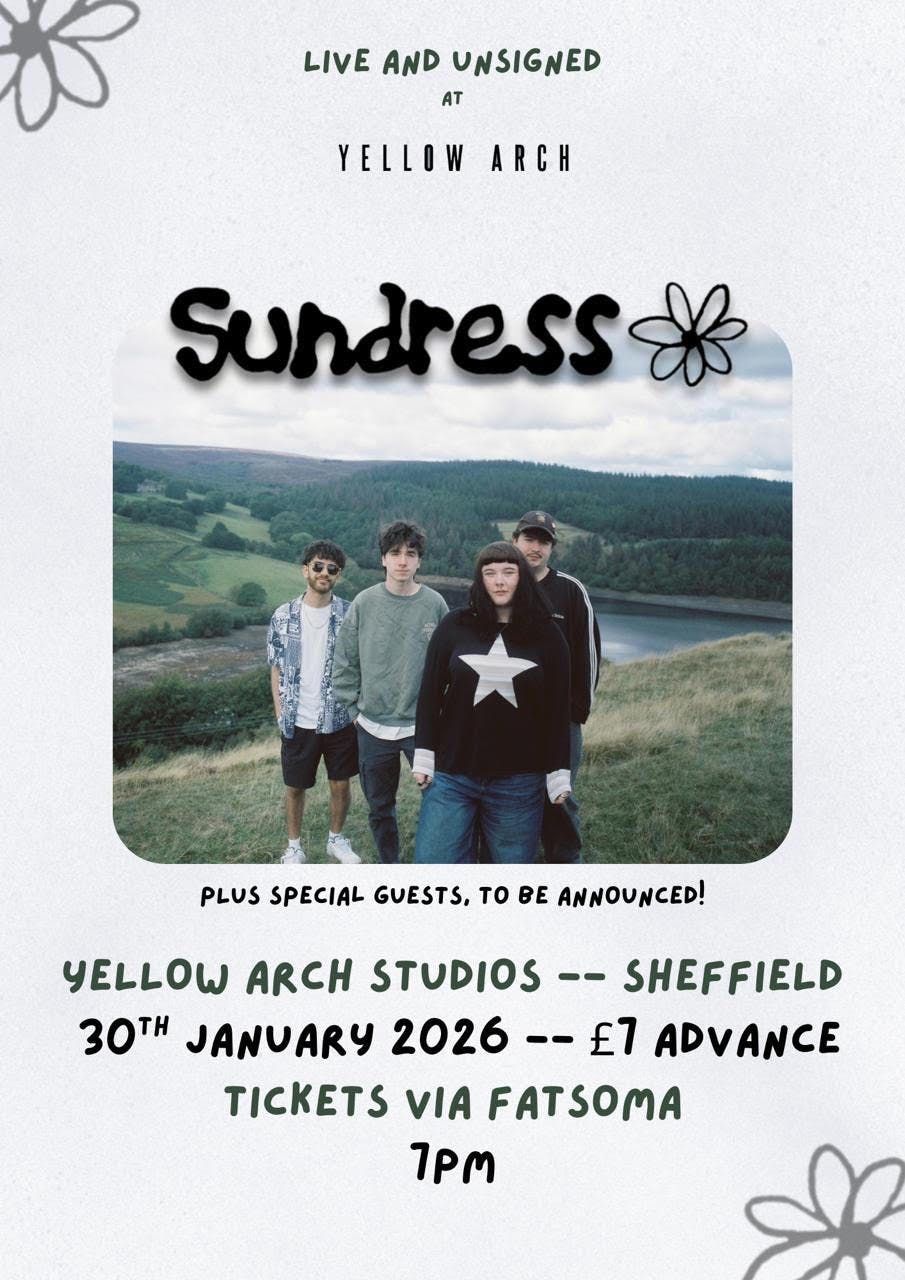 Sundress return to Sheffield for their first-ever headline show at Yellow Arch Studios, fresh from making their mainstage debut at this year’s Tramlines Festival. Blending nostalgic warmth with a shimmering, reminiscent sound, their music feels instantly familiar yet excitingly new — the kind you hear once and want to hear again. Join us for a night that marks a big moment in the band’s journey and a vibe you won’t want to miss.Doors at 7pm