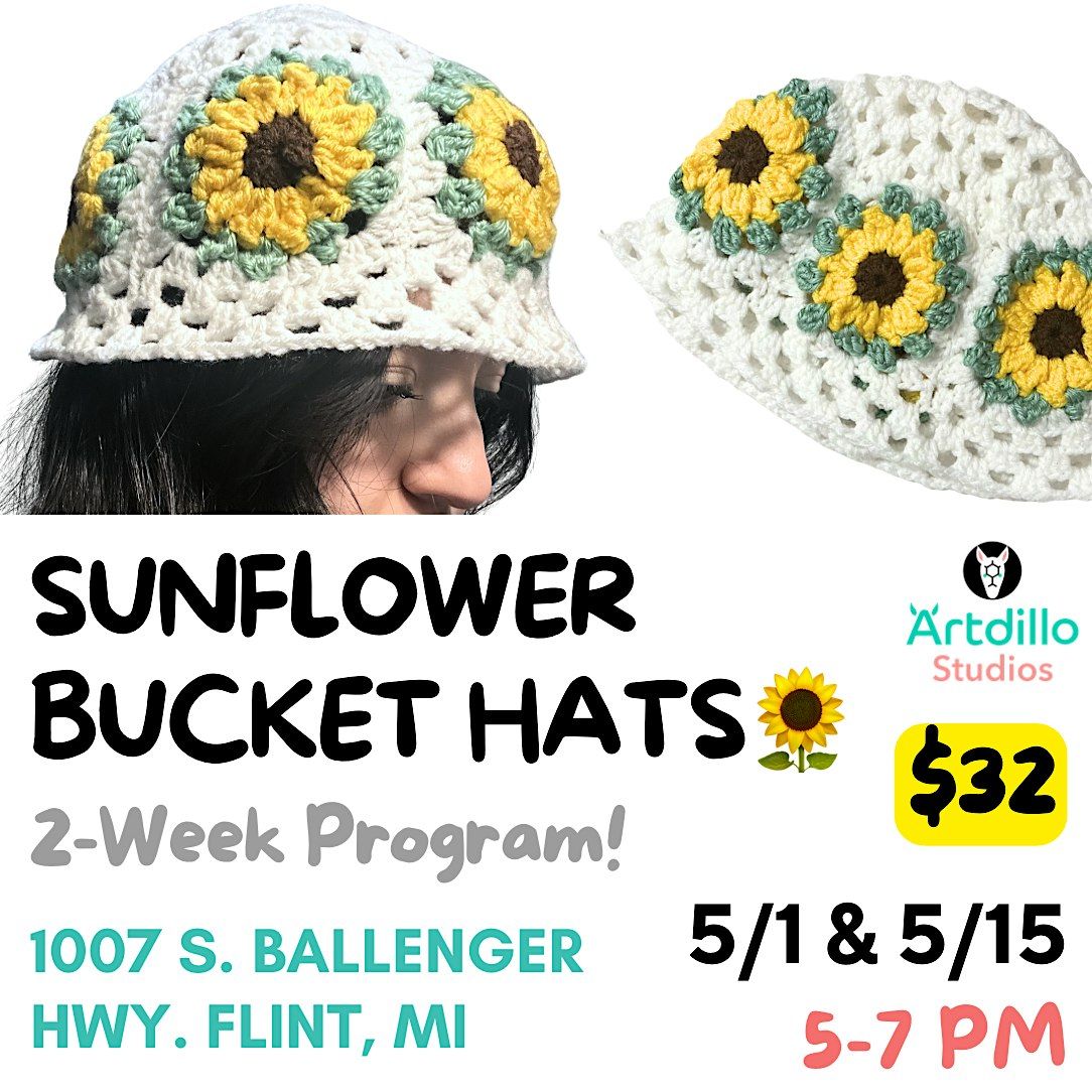 THIS CLASS IS SUITABLE FOR BEGINNERS. Learn how to crochet this granny square bucket hat!! Other variations/patterns available. TWO PROGRAM DATES: 5/1 & 5/15 @5-7p.m.