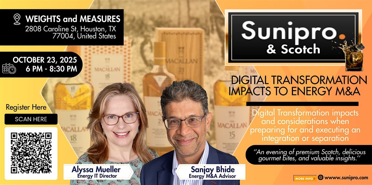 Join us for our annual signature event, Sunipro & Scotch- an evening of networking, premium scotch, delicious gourmet bites, and valuable insights from Alyssa Mueller - Energy IT Director and Sanjay Bhide - Energy M&A Advisor as we discuss the latest trends, challenges and opportunities facing Mergers and Acquisitions in the Energy industry and the Digital Transformation impacts and considerations when preparing for and executing an integration or separation.