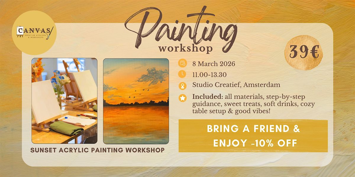 Join us for a cozy Sunset Acrylic Painting Workshop, where you’ll learn how to paint a warm sunset scene using acrylic paints. This workshop is designed for anyone who wants to enjoy painting in a relaxed, welcoming setting & no prior experience needed.