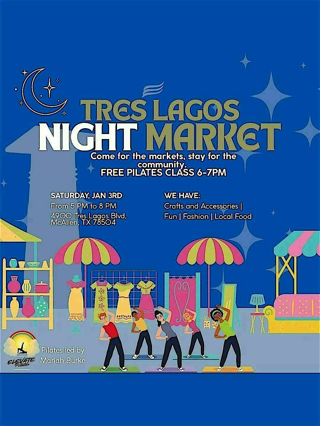 At this Night Market, we'll explore the world of pilates led by Elevate Pilates's founder, MARIAH BURKE, a Certified Personal Trainer and Certified Pilates Instructor. The rejuvenating workout that combines the principles of pilates with the tranquil beauty of viewing the sunsets at Tres Lagos. An amazing sight to see. Whether you're a seasoned Pilates pro or a beginner looking to try something new, all are welcome to participate.