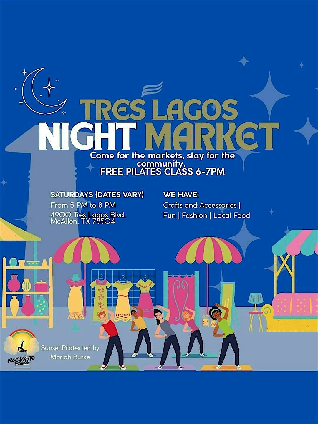 At this Night Market, we'll explore the world of pilates led by Elevate Pilates's founder, MARIAH BURKE, a Certified Personal Trainer and Certified Pilates Instructor. The rejuvenating workout that combines the principles of pilates with the tranquil beauty of viewing the sunsets at Tres Lagos. An amazing sight to see. Whether you're a seasoned Pilates pro or a beginner looking to try something new, all are welcome to participate.