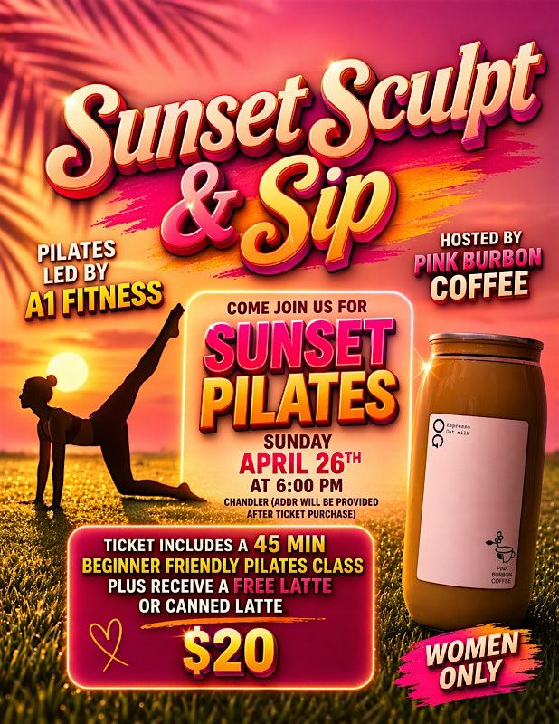 This will be a fun beginner friendly pilates class, Hosted by Rosa (Owner of Pink Burbon Coffee) all from her cozy front yard. We will be on the turf moving our bodies as the sun sets! Enjoy a free coffee after class or take a canned latte to go!
