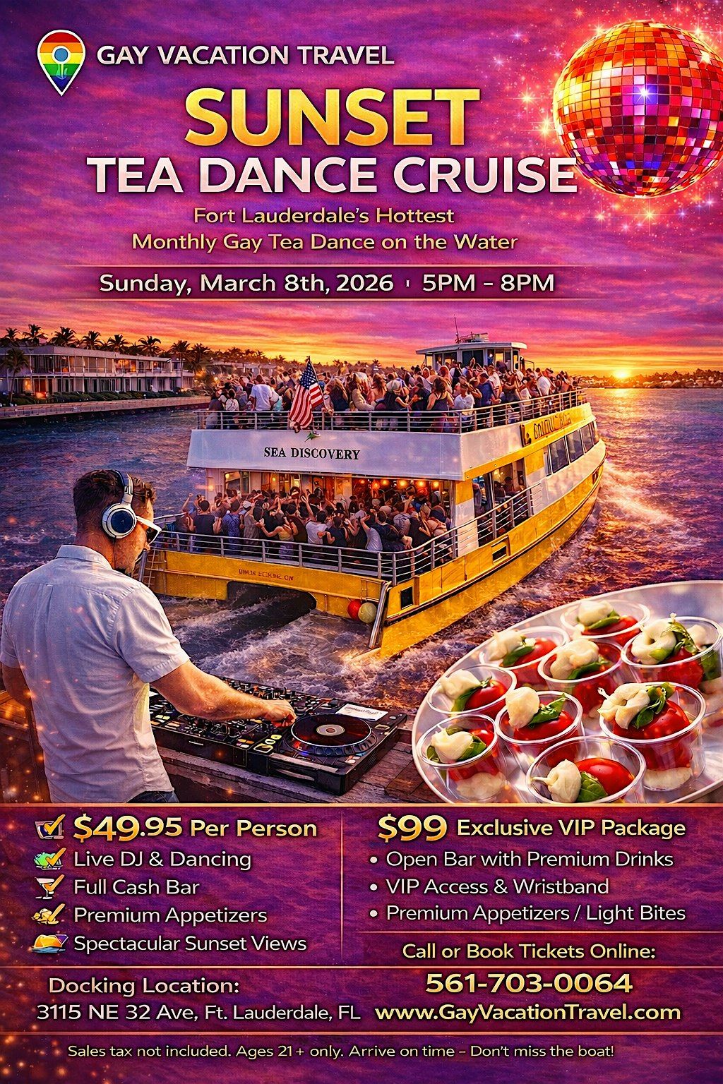 Join Gay Vacation Travel for an unforgettable evening aboard our Sunset Tea Dance Cruise — Fort Lauderdale’s newest LGBTQ+ social event on the water.