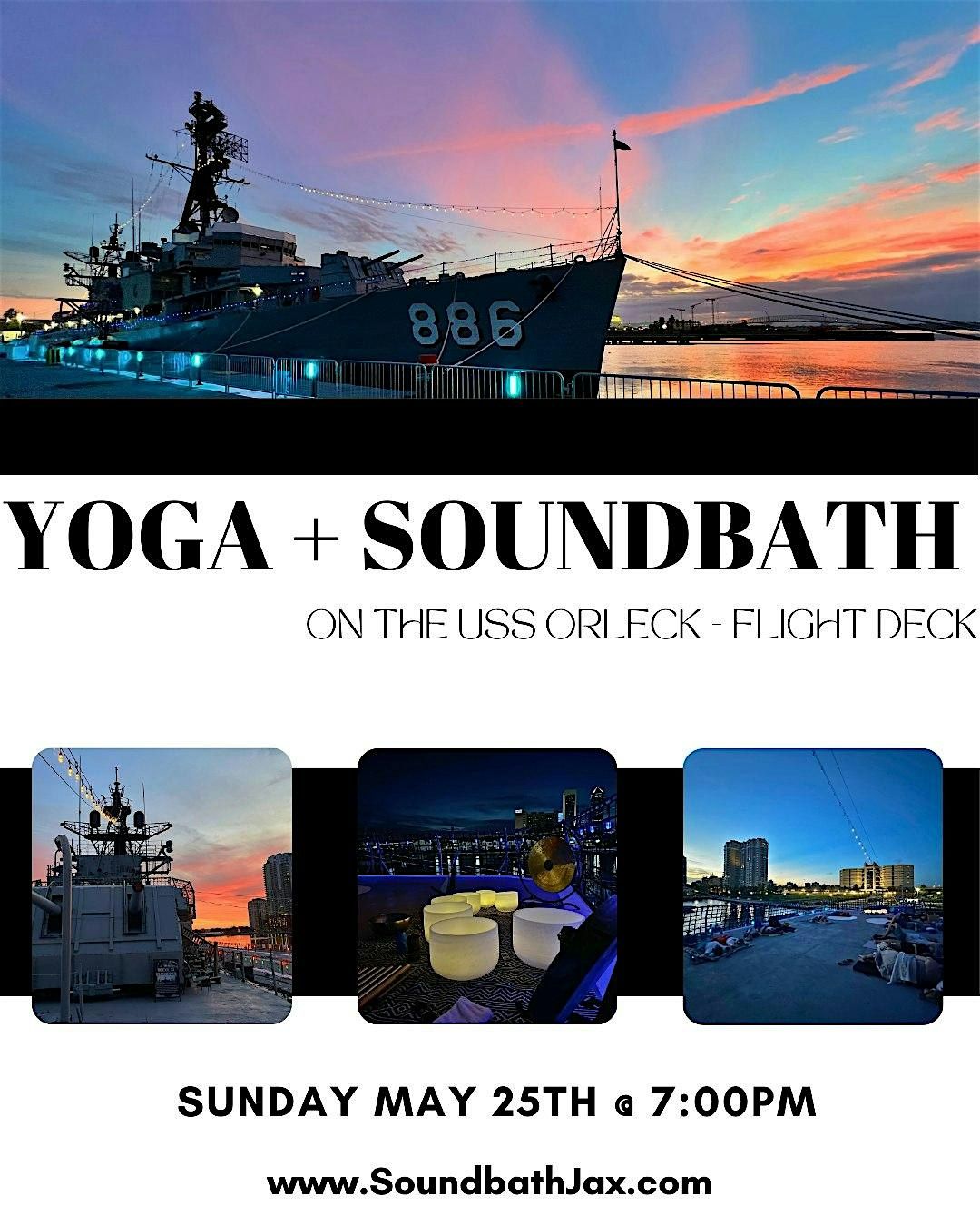 Experience a beautifully guided yoga flow with Susan Kniseley Foy, seamlessly paired with the deeply restorative tones and vibrations of Soundbath Jax. As the sun sets over the St. Johns River and the moon rises above, immerse yourself in a one-of-a-kind 75 minute experience of movement, breath, and sound beneath the open sky. Let the gentle flow and soothing frequencies wash over you, leaving you feeling refreshed, recharged, and fully at peace.