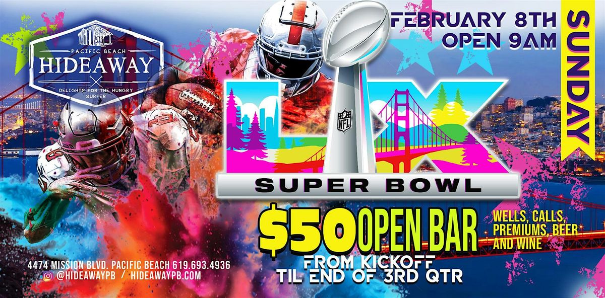 What better way to kickstart the best game of the year but by kickin' it with your friends over at Hideaway, Pacific Beach's local favorite. Come watch the big game with us with an extensive $50 O P E N B A R.