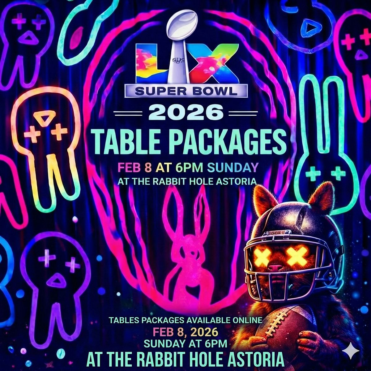 Get ready for the main event! Join us at The Rabbit Hole Astoria for an unforgettable Super Bowl LX viewing experience. We are bringing the heat for 2026 with a high-energy atmosphere, spinning Bad Bunny hits and party anthems all night long. Gather your crew and secure your spot early—Table Packages are available online now. Don't miss a single play, the halftime show, or the best party in Queens.