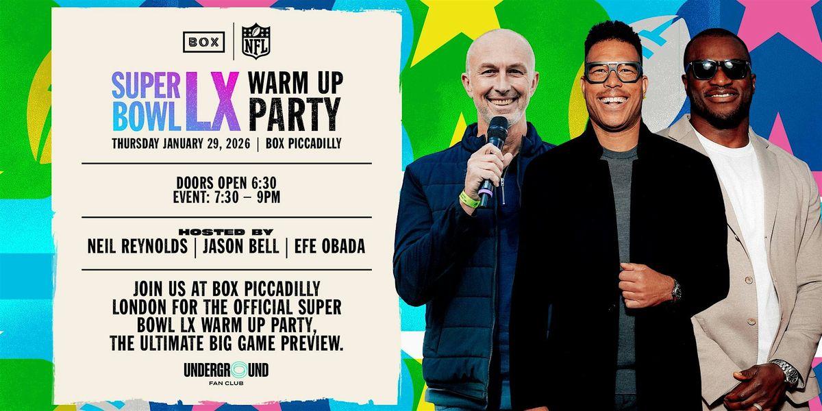 Join NFL UK, BOX and Underground Fan Club for the ultimate high-energy, Super Bowl warm up party, hosted by Neil Reynolds, with special guests, former NFL players Jason Bell and Efe Obada.