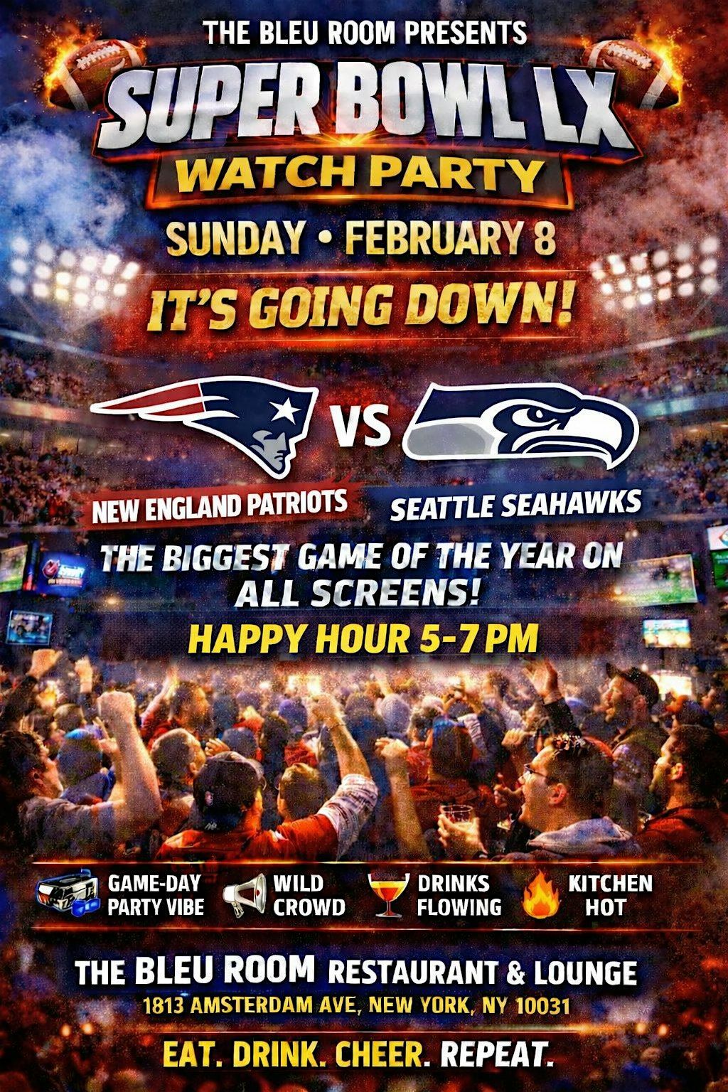Big screens. Big energy. BIG game.Pull up to The Bleu Room for the ultimate Super Bowl watch party. Eat. Drink. Cheer. Repeat.