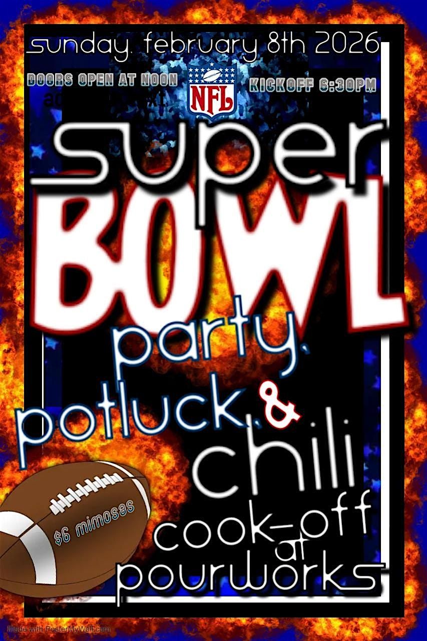PourWorks annual Super Bowl Party, Potluck & Chili Cook off is Sunday, February 8th!! Prizes, Drink Specials, Free Food (with drink purchase). Bring your best Chili and compete for Prizes and bragging rights...or simply judge & bring any dish to share! Doors open at noon, kickoff at 6:30, arrive early to get your table and enjoy some terrific Cocktails, Craft Beers and Chili!