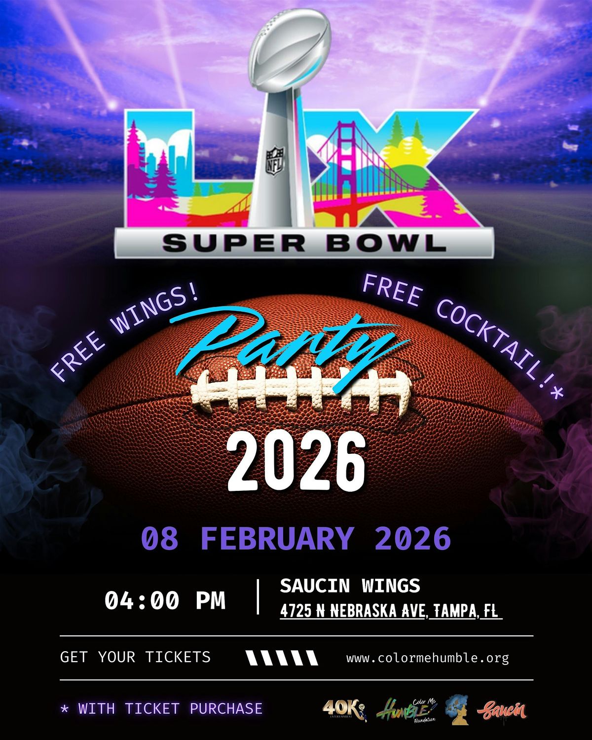 Welcome to the Super Bowl Pre-Game & Watch Party at Saucin Wings! Get ready for an epic evening filled with football, friends, and delicious wings. Join us on February 8, 2026 at 4:00 PM (Eastern Time) as we gear up for the big game. Whether you're a die-hard fan or just in it for the commercials, this event is perfect for everyone. Don't miss out on the fun - mark your calendars and come ready to cheer on your favorite team!