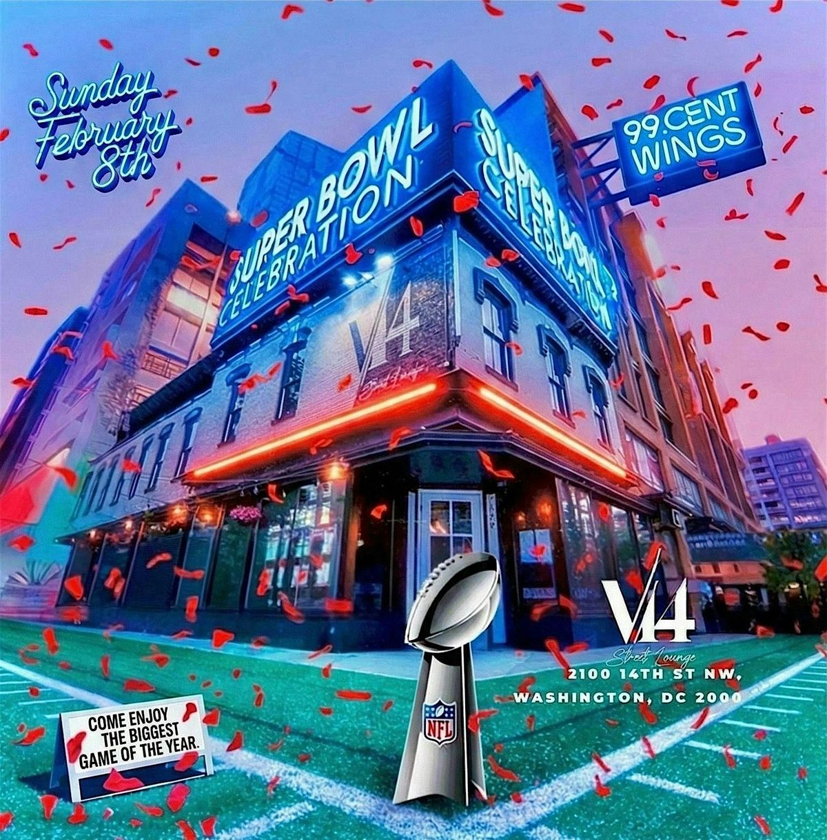 Join us at V1 4 for a fun, high-energy brunch, day party, and Super Bowl watch party in the heart of DC. Come early for brunch, stay late for the game, and enjoy nonstop vibes all day.